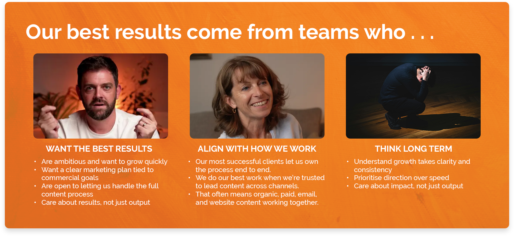 We take responsibility for the full journey, from awareness through to conversion, so content actually supports