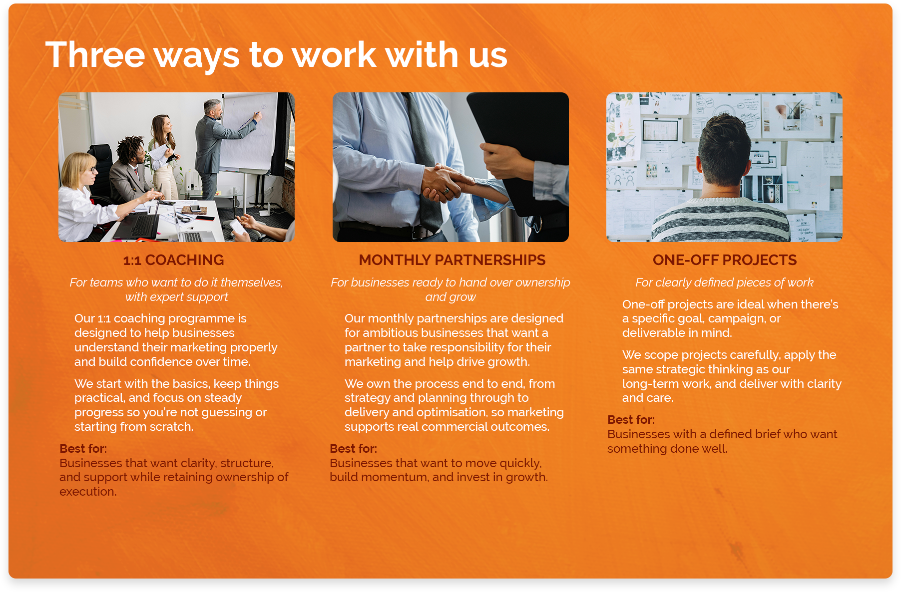 We support businesses at different stages of growth, depending on how much help they need and how quickly they want to move.